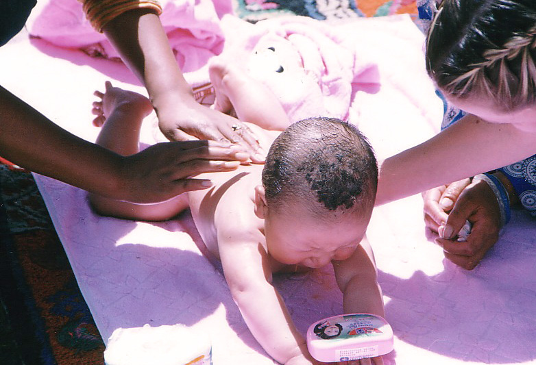 During rickets education and training sessions, the signs of rickets—such as deformed foreheads, chests, and legs—are demonstrated to mothers on their own children. The field teams then teach the parents how to sunbathe children using traditional oils and methods. Each mother receives soap and vegetable oil to continue the sunbathing on their own.